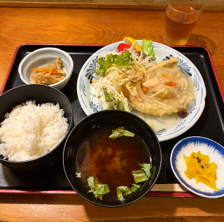 また一緒に飲食店へ入っての夜ご飯、ごちそうさまでした魚のあんかけ定食にしましたが、とても美味しくて、一瞬で完食です